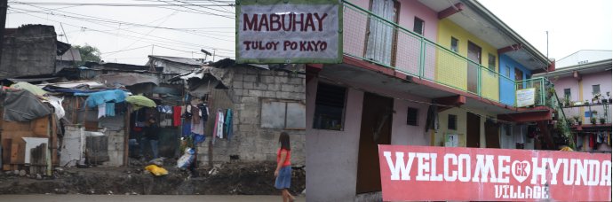 Dans la salle commune, Bart nous invite à partager un repas en nous expliquant l’histoire de la communauté. « Nous avons été squatters toute notre vie. Nous vivions dans des cabanes faites de quelques planches et des toiles en plastique en bordure de Commonwealth Avenue, une des principales artères de Quezon City. Le lieu était qualifié kubeta (toilettes) et nous étions considérés comme des sous-hommes. Nos logements ont été détruits dix fois pour faire place nette et chaque fois on reconstruisait. Fin 2009, c’est un incendie qui a tout dévasté. Nous avons tout perdu. C’est à ce moment que Gawad Kalinga est venu à notre rencontre. Avec le soutien de l’entreprise Hyundai, un projet d’habitations en dur, avec toilettes, alimentation électrique et eau potable a commencé à voir le jour.»