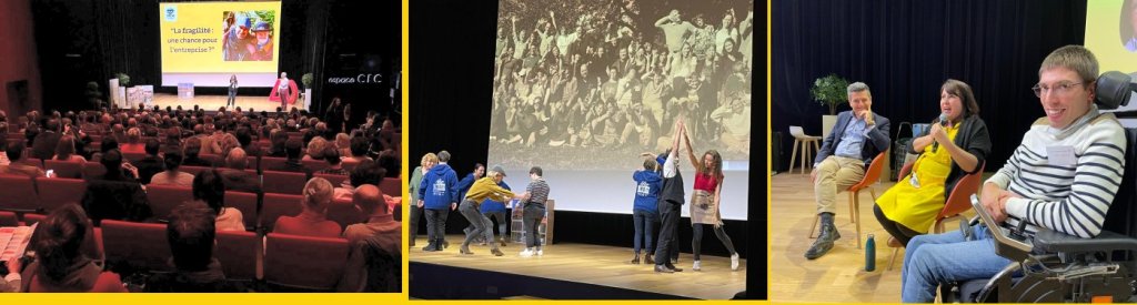 A Nantes, j’ai eu le plaisir de retrouver un compagnon “d’état d’émergence”, Frédéric Laloux (Cf une belle belle rencontre il y a huit ans déjà…), de rencontrer le dynamique et inspirant Fabien Héraud, acteur de sa vie, acteur aussi du film « De toutes nos forces » aux côtés d’Alexandra Lamy et de Jacques Gamblin. En compagnie d’Olivier Riom qui a osé partager sa propre fragilité au sein de son entreprise Vivolum et Katia Tardy qui forme des travailleurs d’ESAT au métier de biscuitier tout en luttant contre le gaspillage de pain avec la Biscuiterie HANDI-GASPI, nous avons eu l’opportunité de résonner avec les 250 participants de l’espace CIC de Nantes.