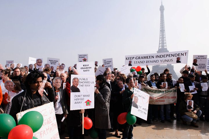Il y a dix-huit nous nous étions mobilisés au Trocadéro à Paris comme dans d’autres villes dans le monde pour soutenir Yunus et l’indépendance de la Grameen Bank. Faut-il rappeler que Yunus ne possède aucune participation dans la Grameen Bank ni aucune action dans aucune autre entreprise du réseau Grameen, créée pour répondre à un problème spécifique lié à la pauvreté.